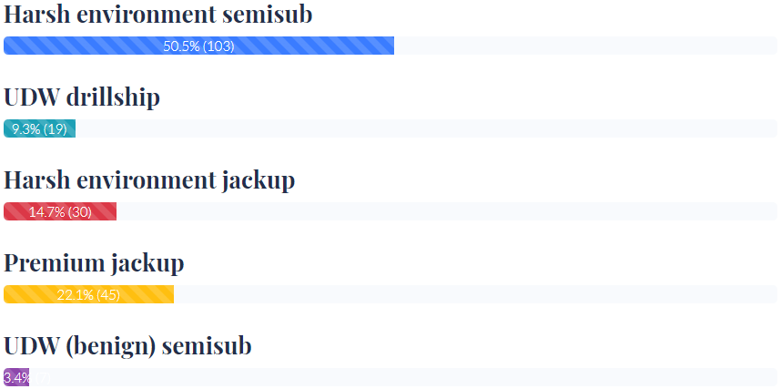 When it comes to preferred types of drilling rigs, harsh environment semisubs are preferred by over 50% of respondents.  This supports the strong outlook for the sector.  Premium jackups came in second place (over 22%).