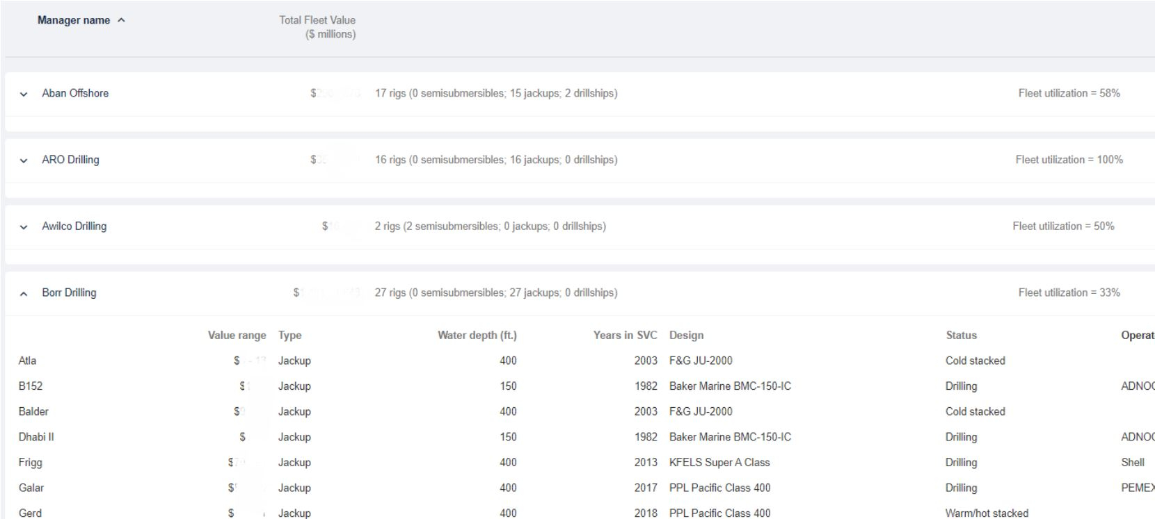- Bassoe Analytics Valuation Service provides users with 24/7 valuations on over 800 offshore rigs as well as contractors’ fleet values, using a clear valuation methodology including multiple drivers.