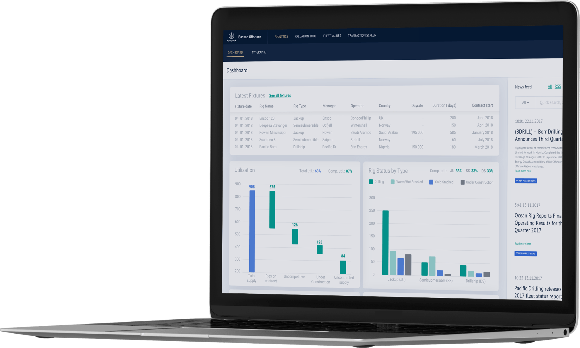 Bassoe Analytics offers a wide range of commercial data, technical data, valuation data (from our Rig Valuation Tool), and graphing tools for: