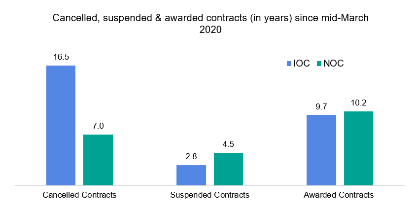 Now, this doesn’t mean that these areas and their NOCs haven’t been doing their fair share of terminating offshore rig deals, just not to the same extent as International oil companies (IOCs) and smaller independents – plus these regions also typically have some of the largest fleets. As can be seen from Figure 2 IOCs have, so far, cancelled over twice the amount of rig time that NOCs have, however NOCs have handed out more suspensions than the IOCs.