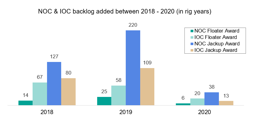 Figure 3: NOC & IOC Backlog Added from Jan 2018 to Jul 2020 in Rig Years (Data from Bassoe Analytics)