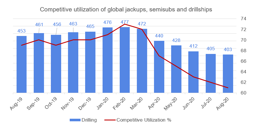 Data from Bassoe Analytics shows a steep decline in competitive utilization across the global jackup, semisubmersible and drillship fleet since the global pandemic and oil price crash in March 2020.