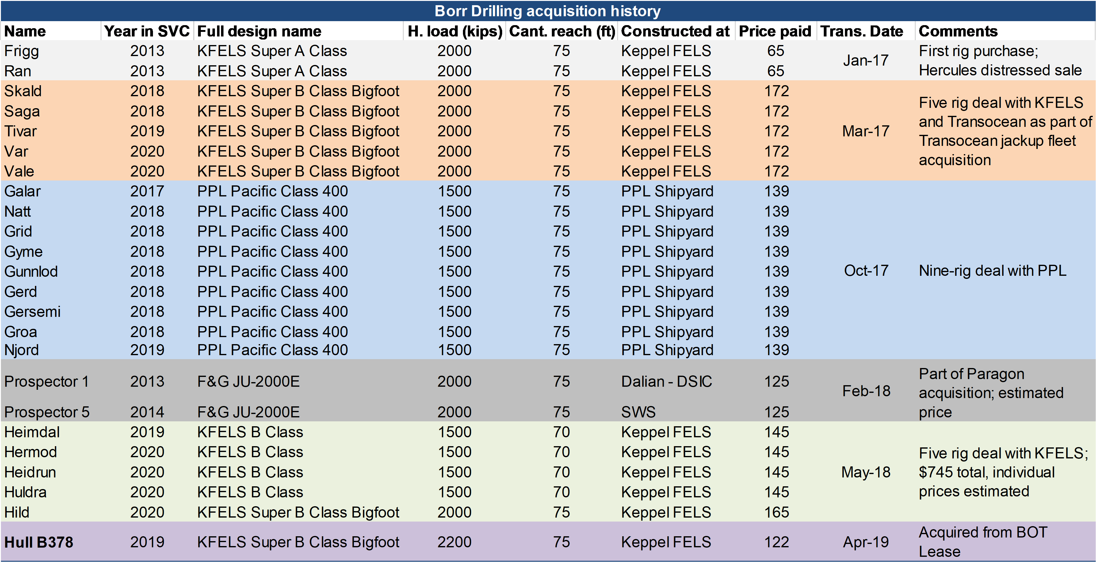 Leaving Borr’s current fleet size and contract backlog alone for a moment, we think the $122 million price makes sense. Actually, it’s the lowest price Borr has paid for a jackup since the first Super A Class rigs acquired from Hercules in January 2017 (excluding the Transocean jackups which were already delivered at the time of the transaction).